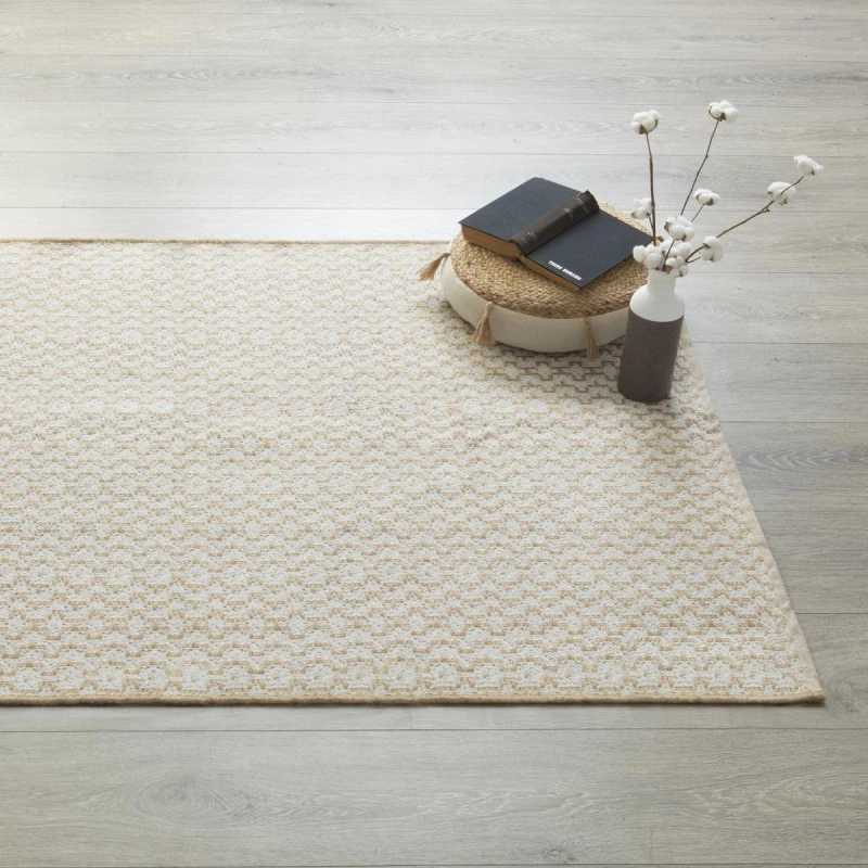 Tapis rectangulaire 120x170cm en jute et coton. Ce tapis naturel et blanc sera idĂ©al pour crĂ©er une ambiance cosy et tendance.Â