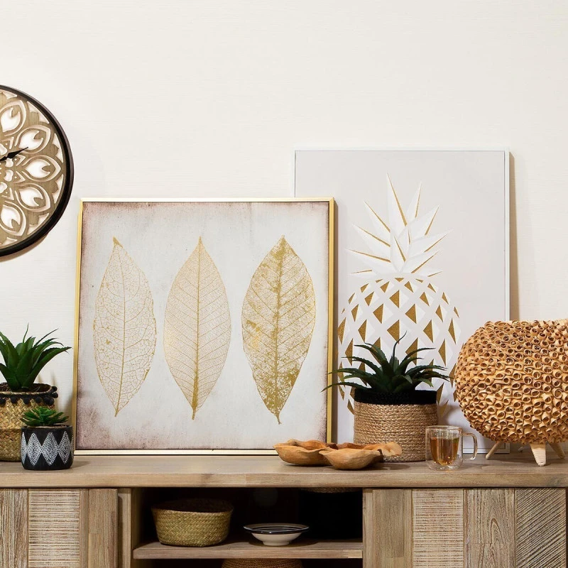 La toile encadrée Feuilles dorées 58×58 cm de la marque Atmosphera s’intégrera facilement dans une pièce en apportant un esprit contemporain.